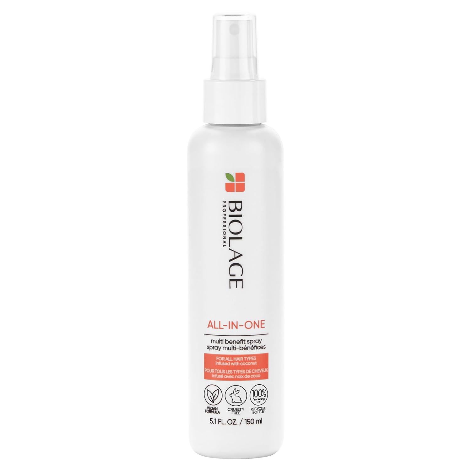 BIOLAGE All-In-One Multi Benefit Spray is a lightweight leave-in primer for all hair types, infused with coconut oil to hydrate, smooth, and add shine while controlling frizz. It detangles, protects from heat, seals split ends, and preps hair for effortless styling, leaving strands soft and manageable. Spray onto wet or dry hair and style as usual.